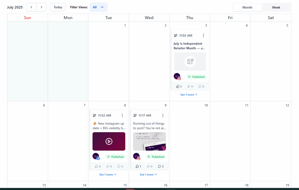 When everything’s uploaded, check in on the calendar view, where you can see how your posts are spaced out over the month. If you notice a gap, just drag and drop your posts to rearrange.